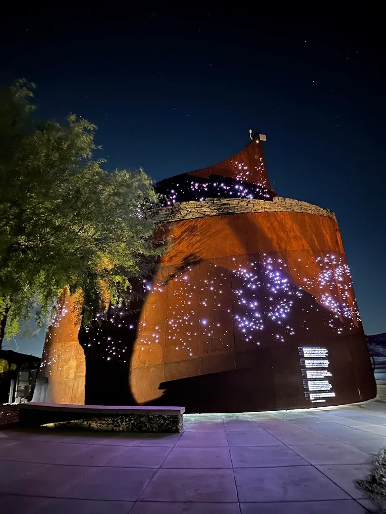 I timed my visit for late afternoon into evening, arrived around sunset to catch the golden light painting the mountains, then stayed as dusk settled. As the sun drops, tiny embedded lights on the tower's exterior start glowing, turning the whole spiral into a twinkling constellation of stars. It's magical. The tower literally lights up like a beacon in the desert night. Once full dark hits, Arizona skies clear up fast, the elevated vantage point gives you a clearer, less obstructed view of the stars than ground level. There are fewer lights from the community below, and you're just high enough to feel immersed. I spotted the Milky Way stretching overhead on a clear night, plus bright planets and constellations popping out vividly. It's peaceful. No crowds, just the quiet desert sounds and that profound sense of vastness that makes you ponder existence.