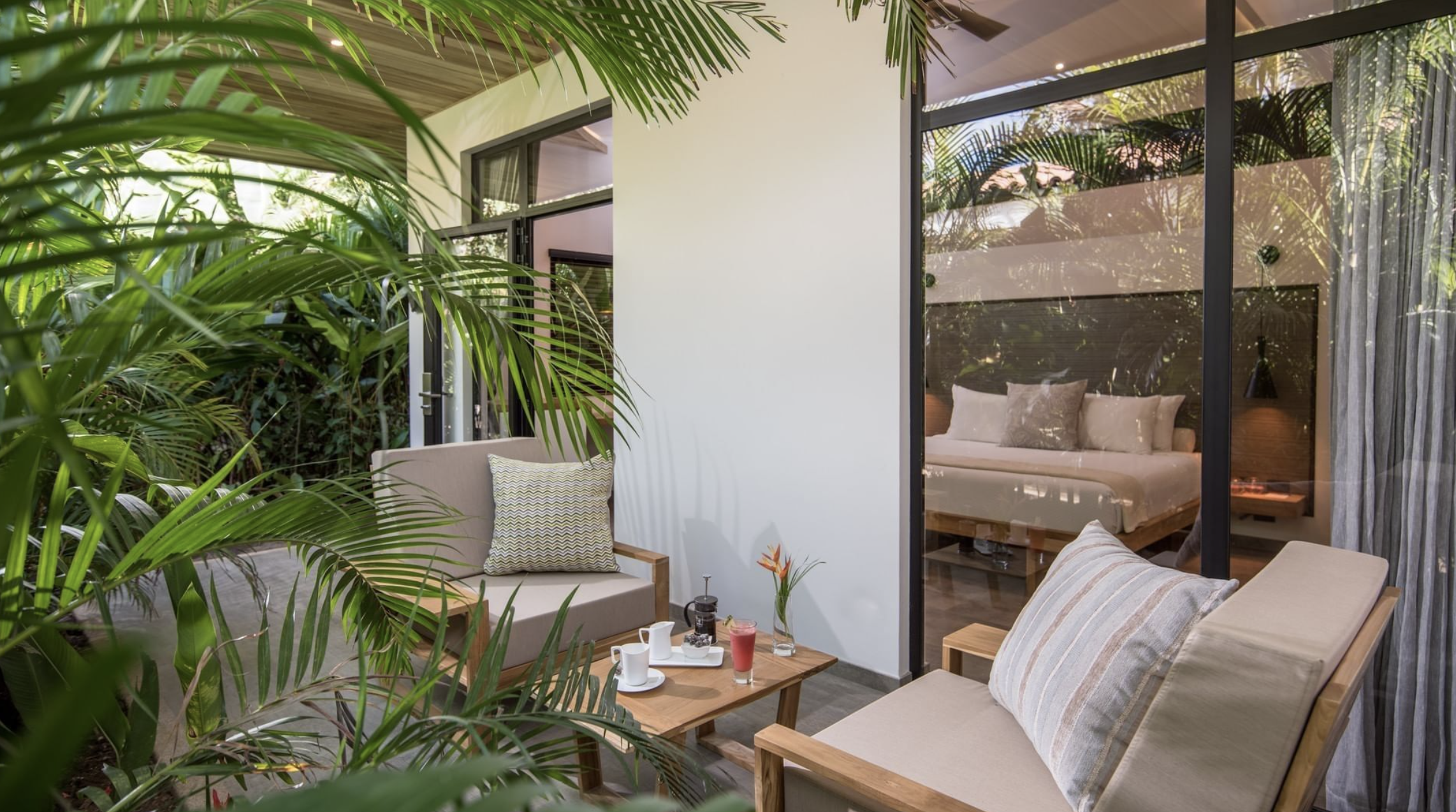 The terrace is covered, shaded, and faces the jungle garden rather than any road or public space. There is no foot traffic. No ambient noise from other guests. No music from a nearby bar. The sounds are birds, the occasional rustle of something moving through the vegetation, and the distant suggestion of the Pacific if the wind is in the right direction.