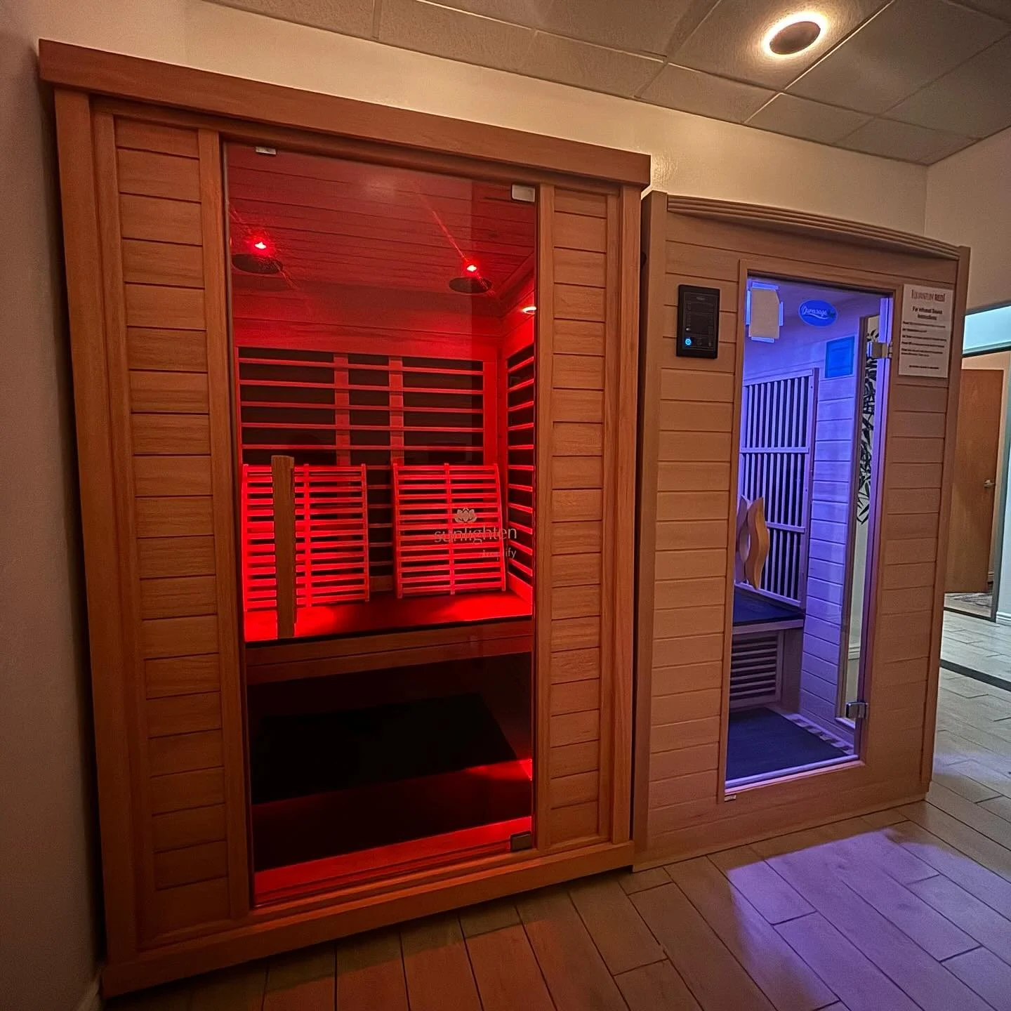 He walked me back through a short hallway past the infrared sauna pods (they offer those too, but I was here for the light). The treatment area had a couple of large upright red light panels. Tall, sleek vertical arrays with hundreds of LEDs, adjustable stands, and a small private booth setup with a mirrored wall, cushioned mat on the floor, and a control touchscreen. They call their premium setup the "Quantum Panel", combining 660nm red and 850nm NIR wavelengths, high irradiance for deep penetration.