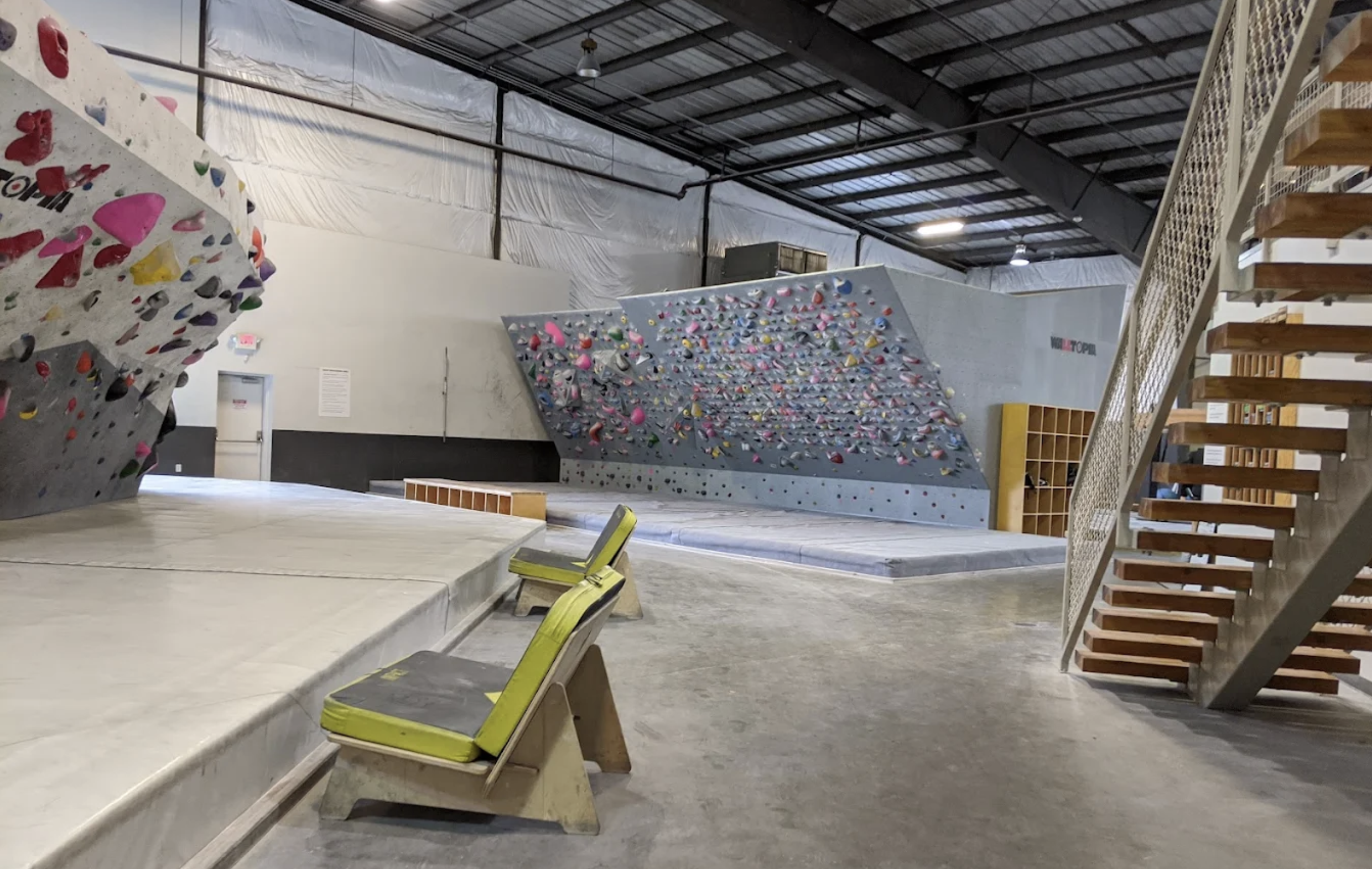 The vibe is super inclusive: climbers of every level, ages from kids to gray-haired vets, solo folks projecting, groups cheering each other on. There's a training area with campus boards, moon boards (those LED-lit interactive walls for standardized problems), hangboards, weights, and even a fitness/yoga space for classes (they run yoga, mobility, strength sessions). I took a break on the comfy seating areas picnic-style tables, couches grabbed a water from the fountain (they encourage hydration), and just soaked in the energy. Music pumps at a good volume, not overwhelming, and natural light pours in from high windows during the day.