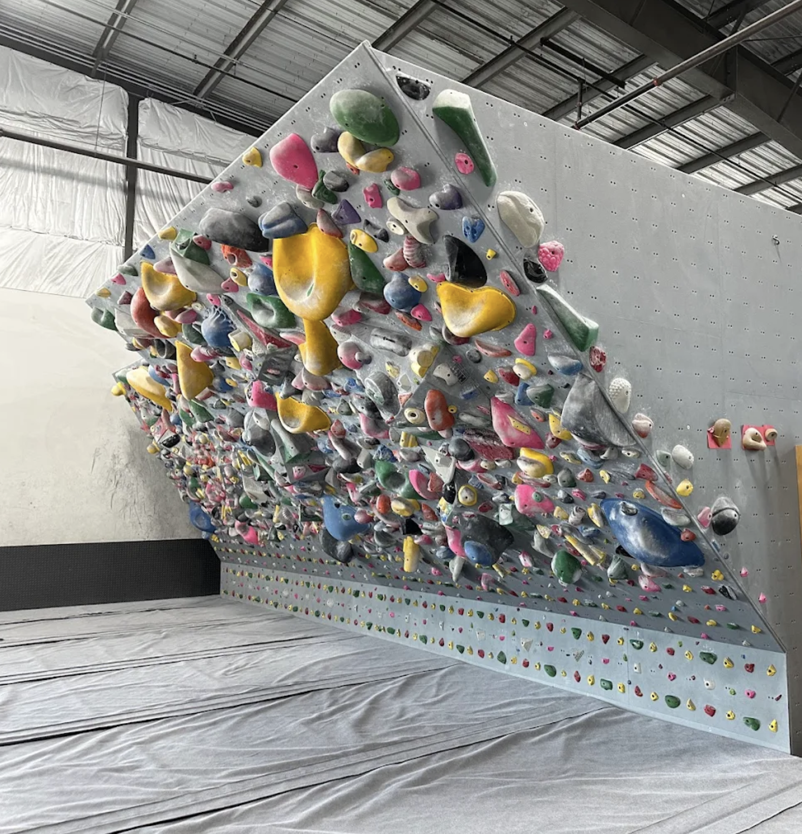 No harnesses or ropes here this is pure bouldering, meaning short, powerful climbs over thick crash pads (they're generous and well-maintained, so falls feel soft even from 12-15 feet up). The gym layout is insane: towering walls that mimic natural rock features overhangs, slabs, vertical faces, caves, and even some dynamic jump-start problems. Hundreds of boulder problems set at any time, color-coded by difficulty (V0 beginner all the way to V10+ beast mode), with fresh sets every few weeks from world-class routesetters. They keep it diverse: slabs for footwork precision, compression problems squeezing between features, powerful dynos that make you launch, and techy traverses that test your body tension.