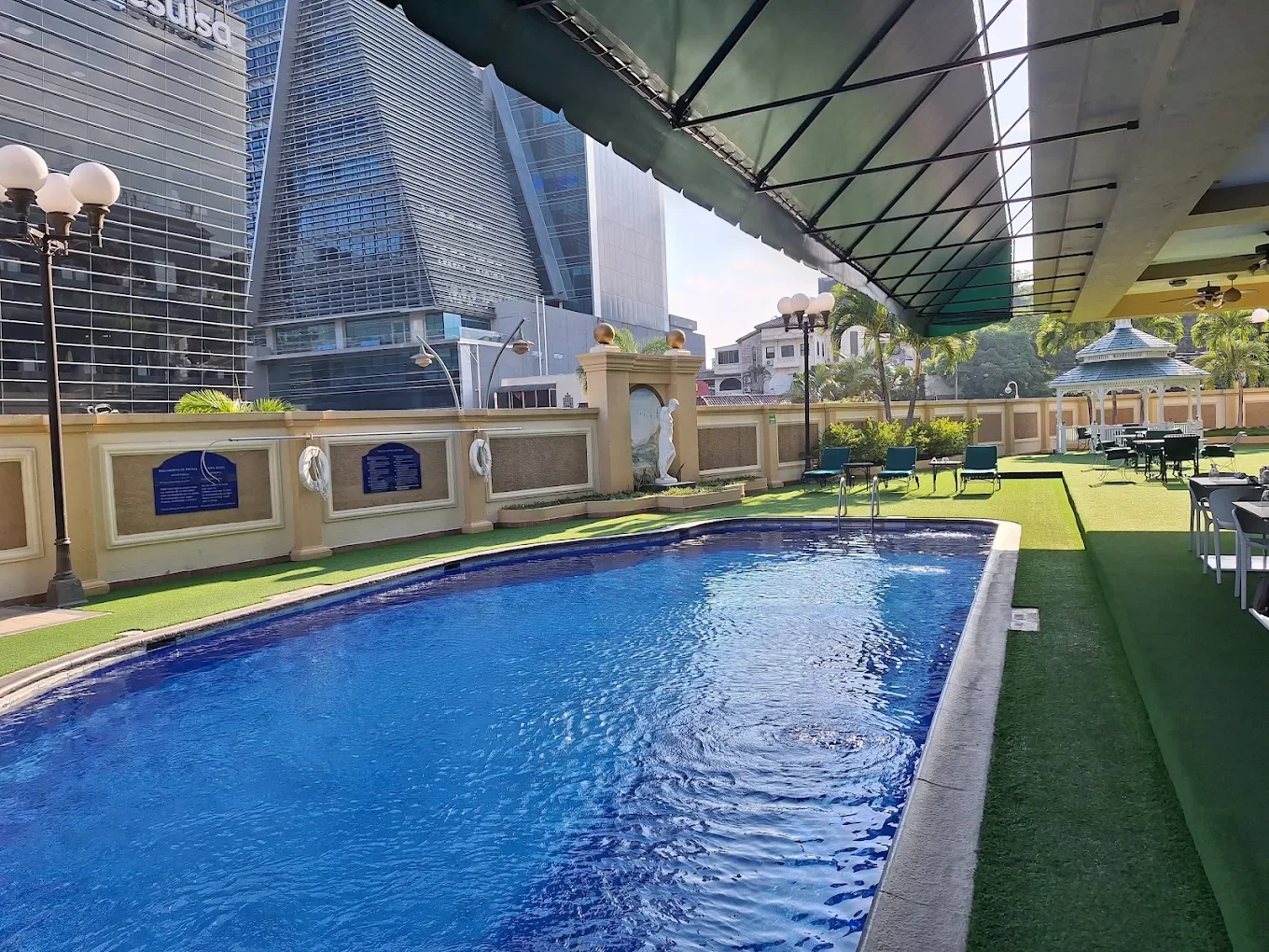 The outdoor pool sits on a terrace/rooftop level with city views - peaceful and relaxing, even in the capital's center. It's not enormous, but the loungers, umbrellas, and shaded spots (plus bar service) make it great for a quick dip or reading after the drive.